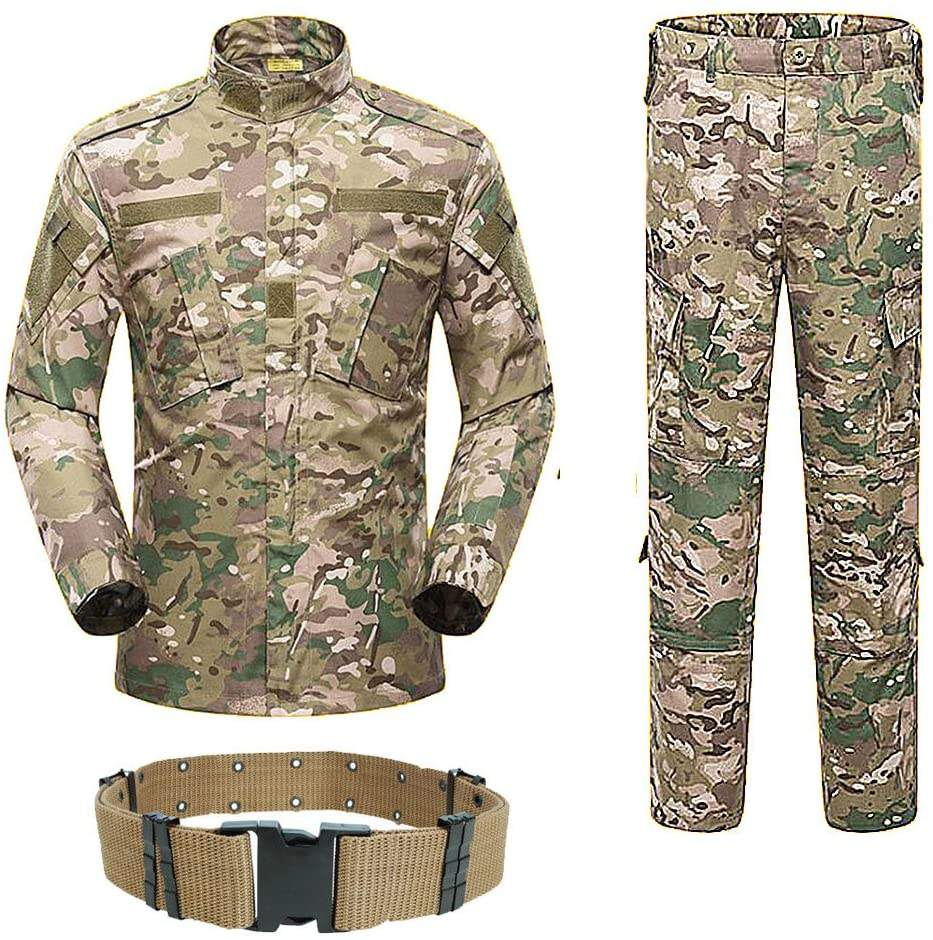 ชุดแจ็คเก็ตและกางเกงล่าสัตว์ผ้าผสมโพลีเอสเตอร์ลายพรางมัลติแคมสำหรับฤดูหนาว ทนทาน ผ้า 3 ชั้น พร้อมเข็มขัด สำหรับผู้ชายแนวแทคติค