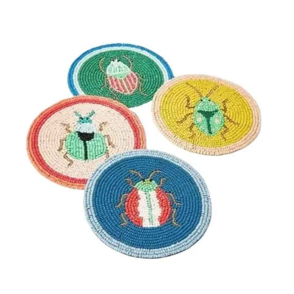 ชุดจานรองแก้วลูกปัดหลากสีลายแมลงเต่าทอง งานปักลูกปัดแก้วทรงกลม ทำมือ ตกแต่งโต๊ะธีมธรรมชาติ