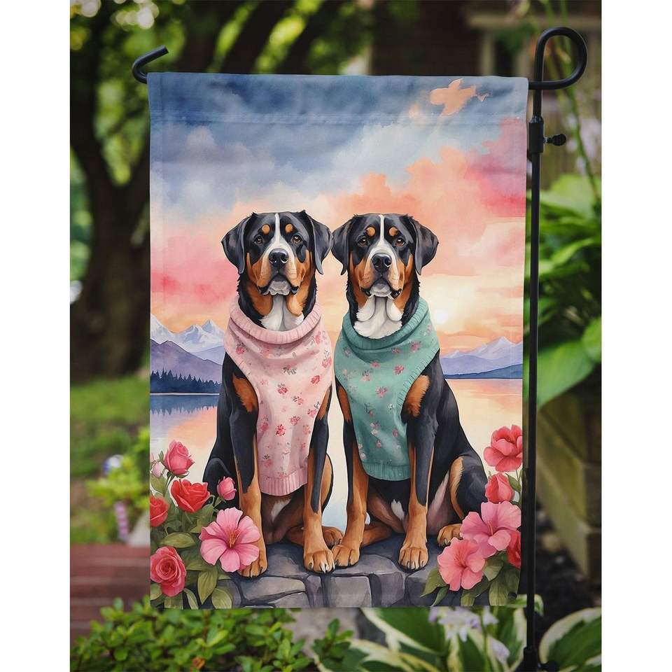 ธงสองหัวใจสำหรับสวนรูปสุนัขภูเขาสวิสสีหลายสีสำหรับตกแต่งลานแบนเนอร์สำหรับชานบ้านงานศิลปะสวนดอกไม้