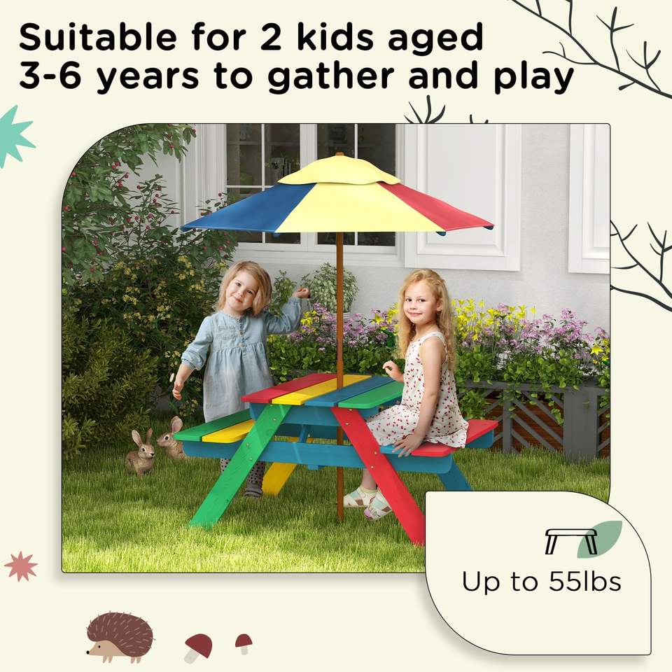 ชุดโต๊ะปิกนิกไม้หลากสีสำหรับเด็กมีร่มกันแดดถอดออกได้ทนทานสำหรับเด็กอายุ3-6ปีเพื่อความสนุกกลางแจ้ง
