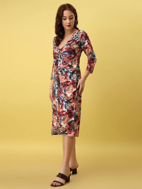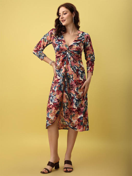 Multicoloured Floral Print A-Line Dress V-neck Short Sleeve Midi Length Flared Hem Georgette Fabric Natural Waist Eco-Friendly