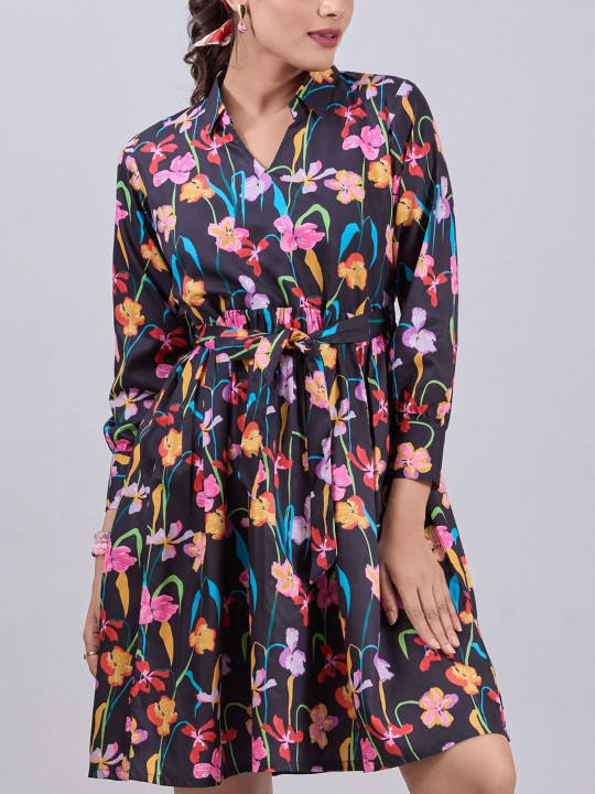 ชุดเดรสลายดอกไม้หลากสี ทรงเอ็มไพร์ คอวี แขนยาว ผ้าลูกไม้ ระบายอากาศได้ดี กระโปรงทรงเอไลน์ยาวปานกลาง เอวธรรมชาติ เป็นมิตรต่อสิ่งแวดล้อม