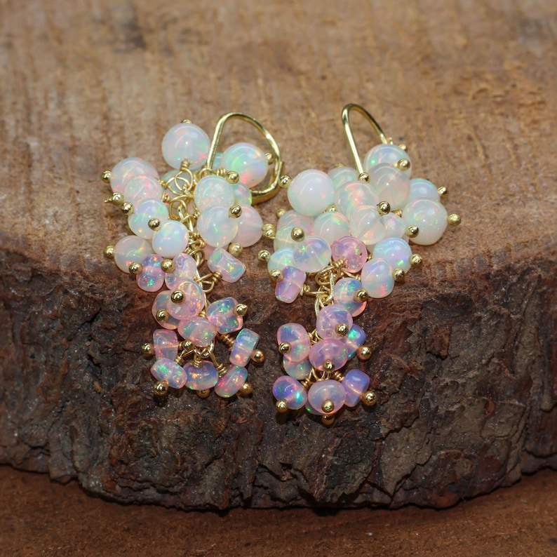 ต่างหูประดับเม็ดโอปอลขาวหลากสีแบบคลัสเตอร์ เปล่งประกายด้วยอัญมณี