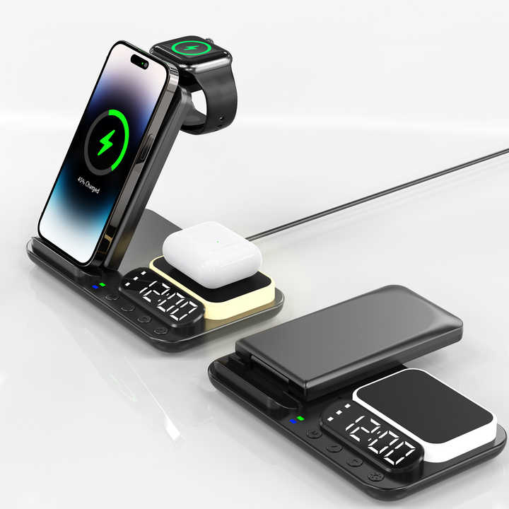 เครื่องชาร์จไร้สาย4 in 1อเนกประสงค์พร้อมนาฬิกาปลุกสำหรับ iPhone 14 15 Watch airpods