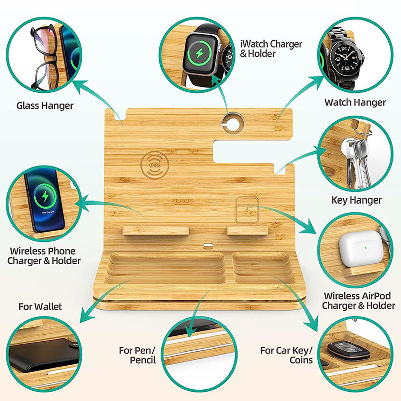 6 In 1 Bamboo Wireless Charging Station Organizer