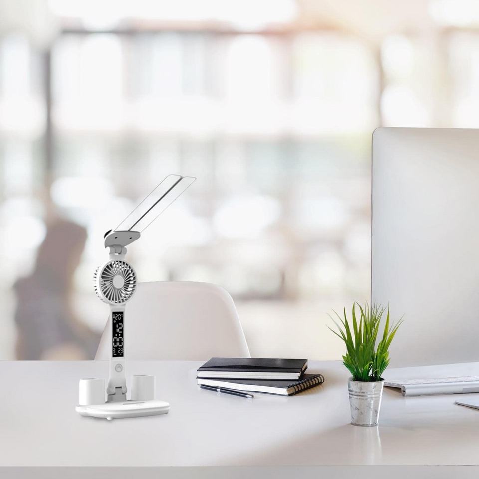โคมไฟอ่านหนังสือ LED แบบพับได้อเนกประสงค์ ขนาดเล็ก ปรับความสว่างได้ ป้องกันสายตา พร้อมพัดลมและช่องใส่ปากกา สำหรับนักเรียน