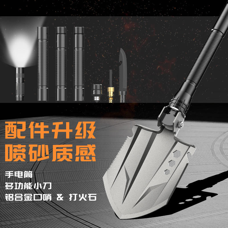 พลั่วพับได้อเนกประสงค์ 13.5 นิ้ว สีดำทั้งหมด สำหรับตั้งแคมป์กลางแจ้ง ป้องกันตัว พร้อมไฟฉาย