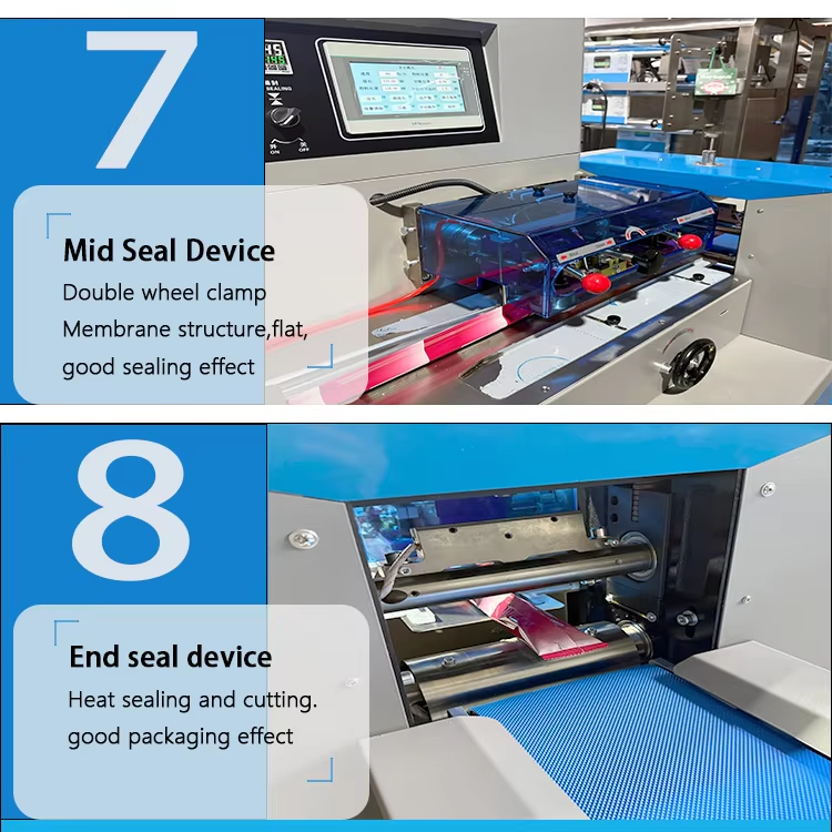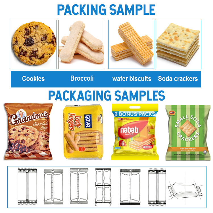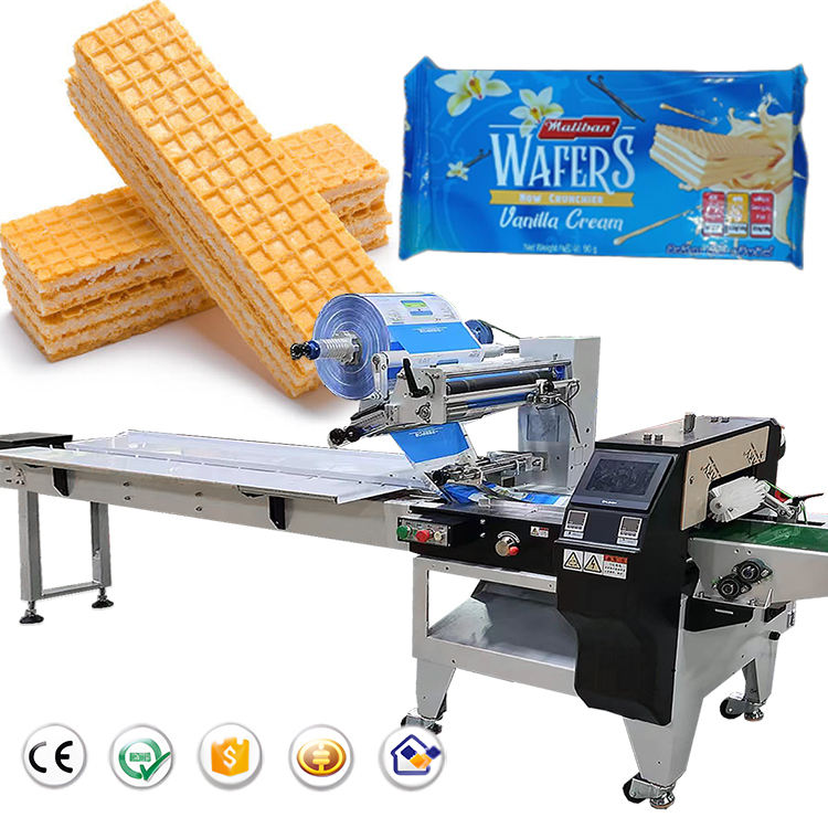 เครื่องแพ็คบุคคลแพ็คเวเฟอร์ได้หลายฟังก์ชันเครื่องบรรจุหมอนเวเฟอร์บิสกิตสามชิ้น