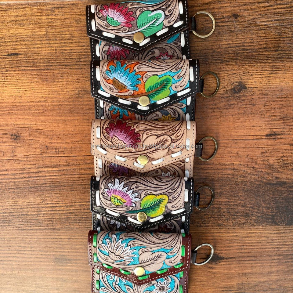 กระเป๋าใส่เหรียญหนังขนาดเล็กดีไซน์เนอร์ถือได้หลายฟังก์ชันพร้อมพวงกุญแจกระเป๋าสตางค์ผู้หญิงหนังแท้ตะวันตกลายดอกไม้
