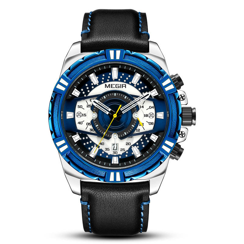 นาฬิกาผู้ชายโครโนกราฟอเนกประสงค์ นาฬิกาข้อมือควอทซ์หนังแท้สไตล์สปอร์ตและลำลอง