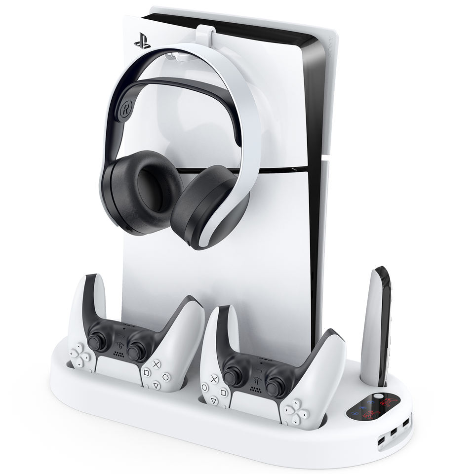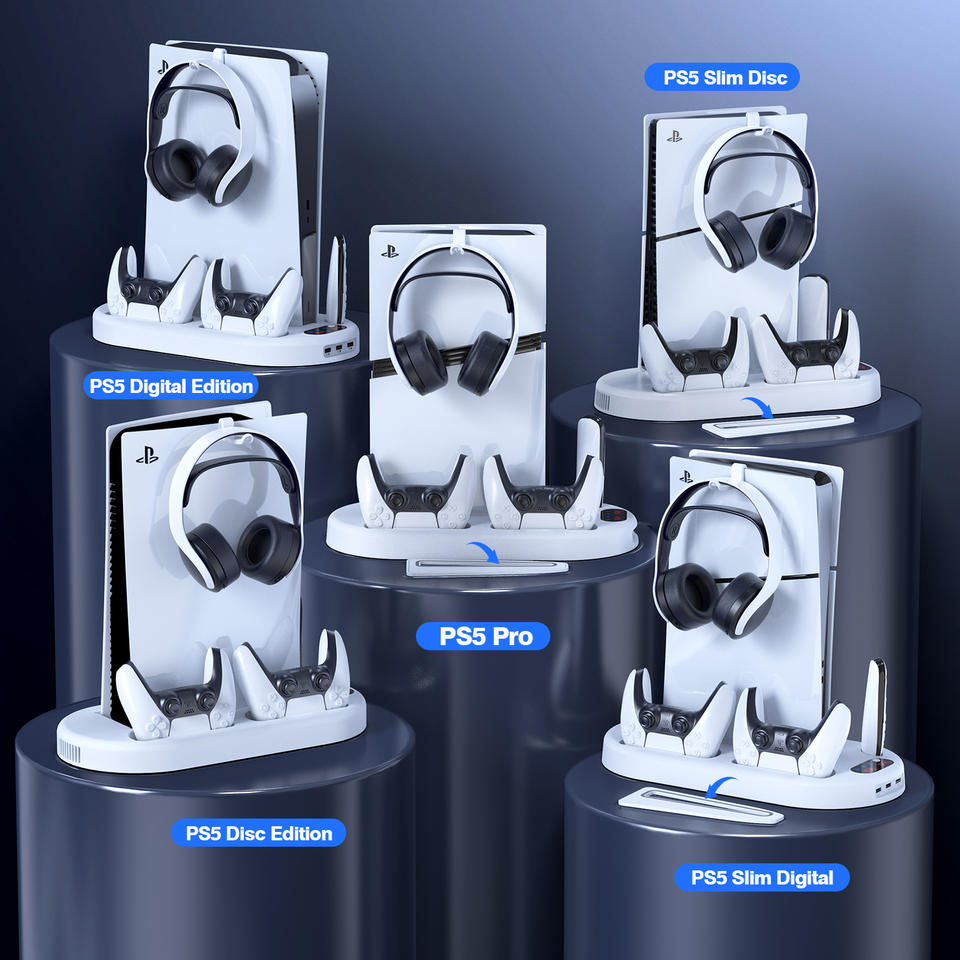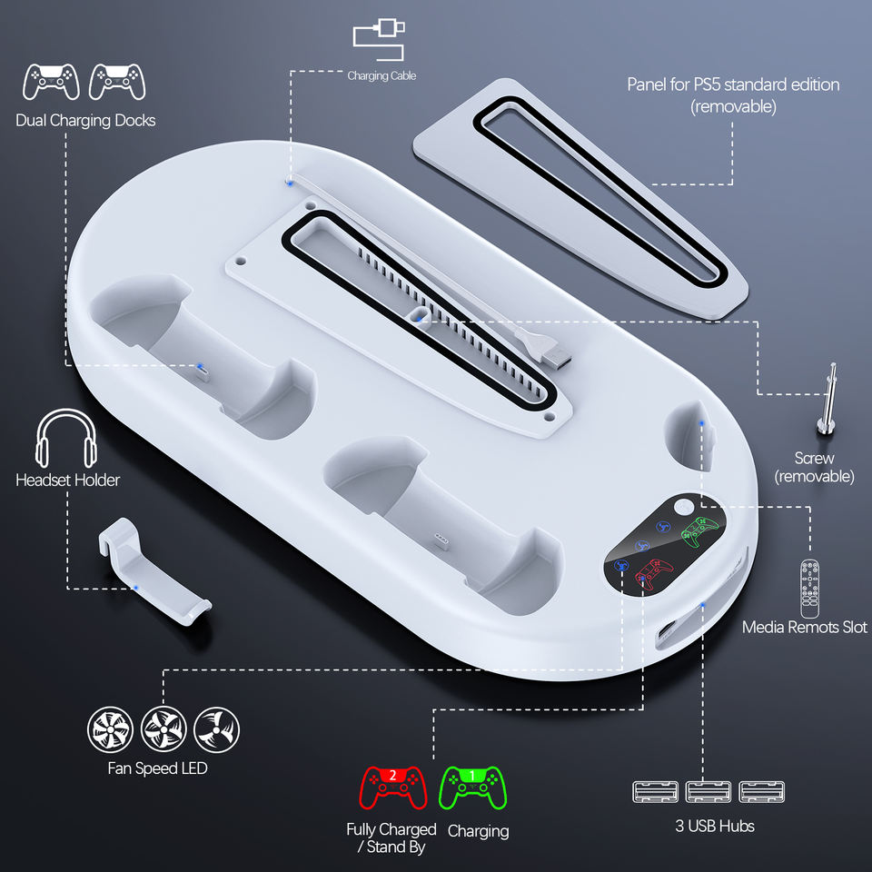 แท่นวางอเนกประสงค์สำหรับ PS5 พร้อมพัดลมระบายความร้อน ช่องเก็บแผ่นเกมส์ และแท่นชาร์จจอยเกมส์ สำหรับ PS5/PS5 SLIM