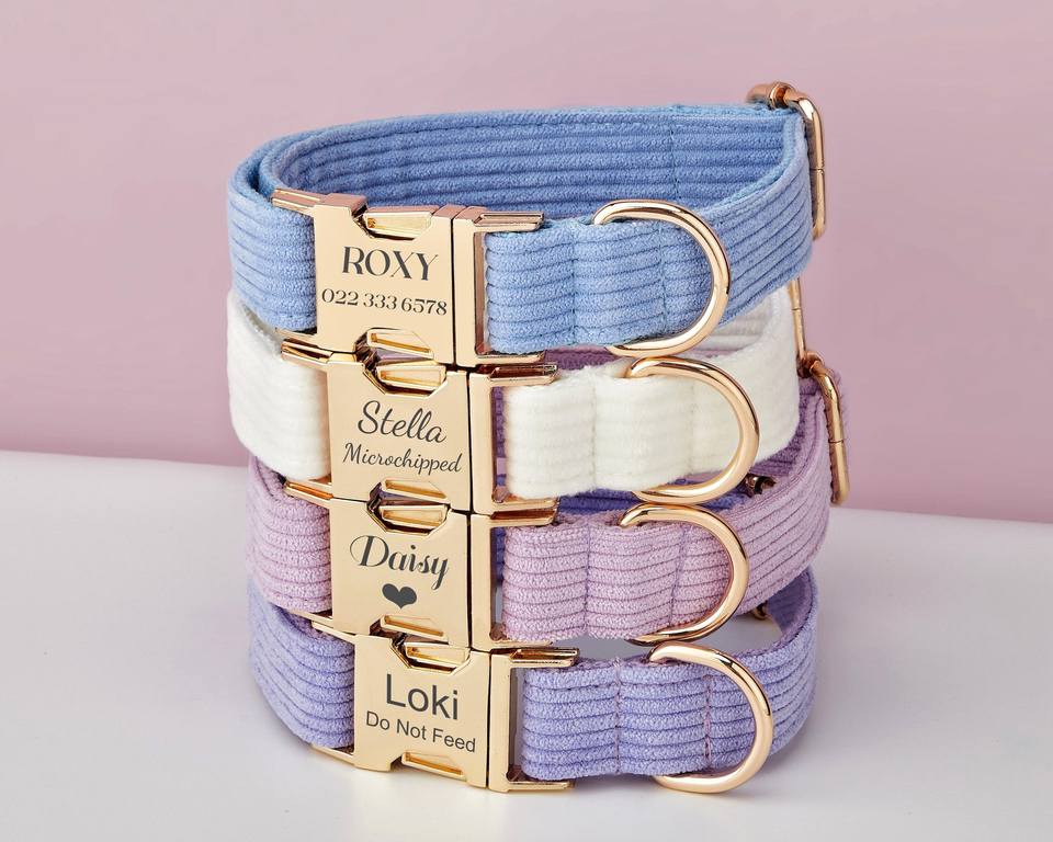 ชุดสายจูงคอสุนัขผ้าลูกฟูกหลากสีมีหัวโบว์สีฟ้า + ขาว + ม่วงอุปกรณ์สลักชื่อสัตว์เลี้ยงหัวเข็มขัดโลหะสำหรับงานแต่งงาน
