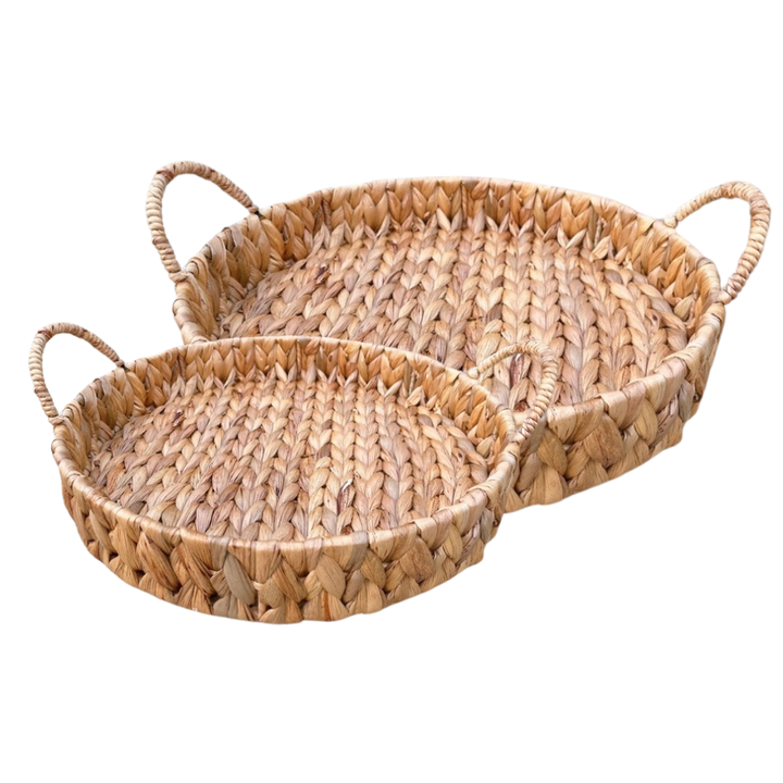 ตะกร้าใส่ผลไม้ถาดใส่น้ำผักตบชวาอเนกประสงค์ตะกร้าใส่ผลไม้ที่เสิร์ฟเครื่องดื่มของขบเคี้ยวของตกแต่งบ้านเป็นมิตรต่อสิ่งแวดล้อม