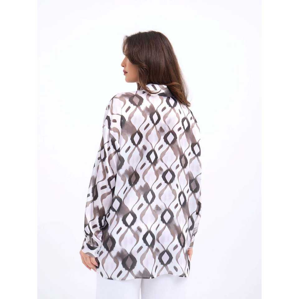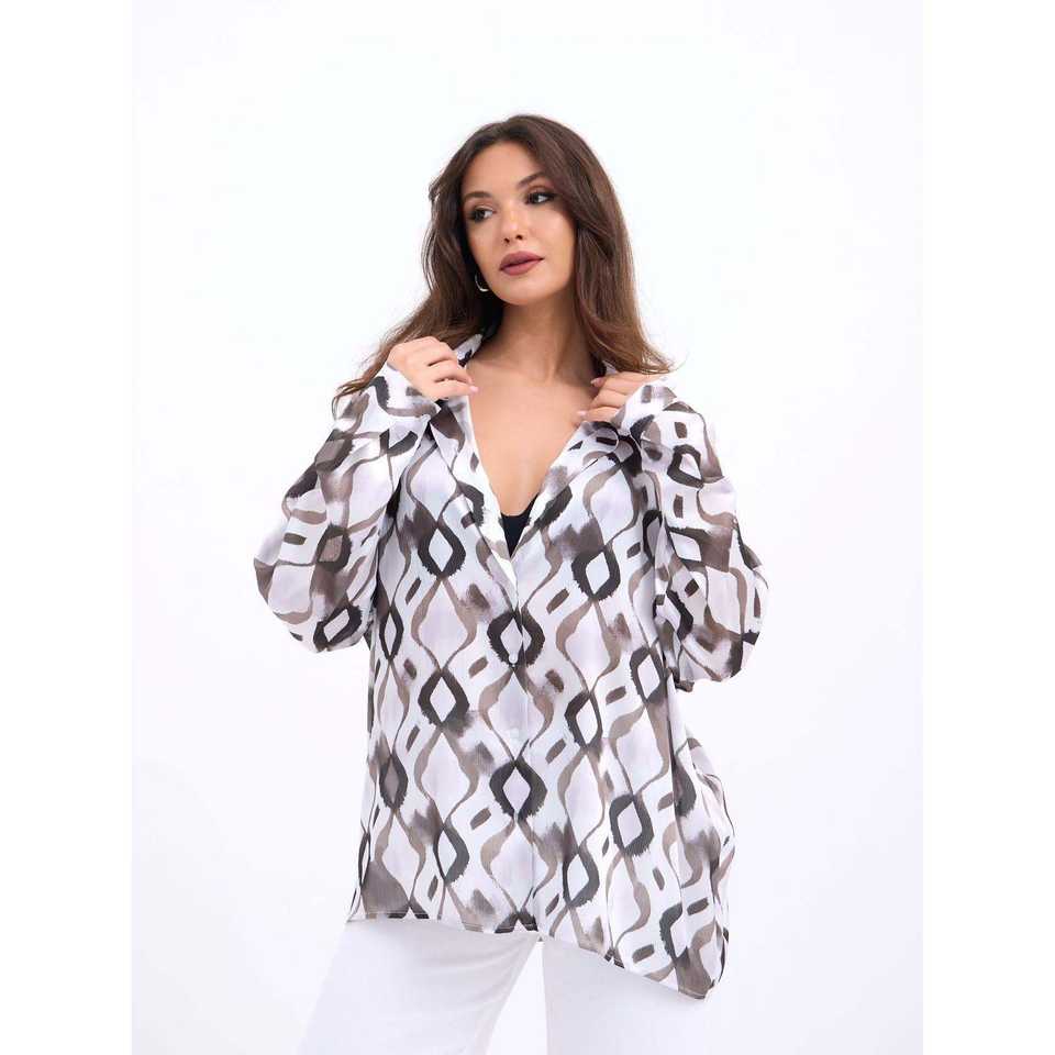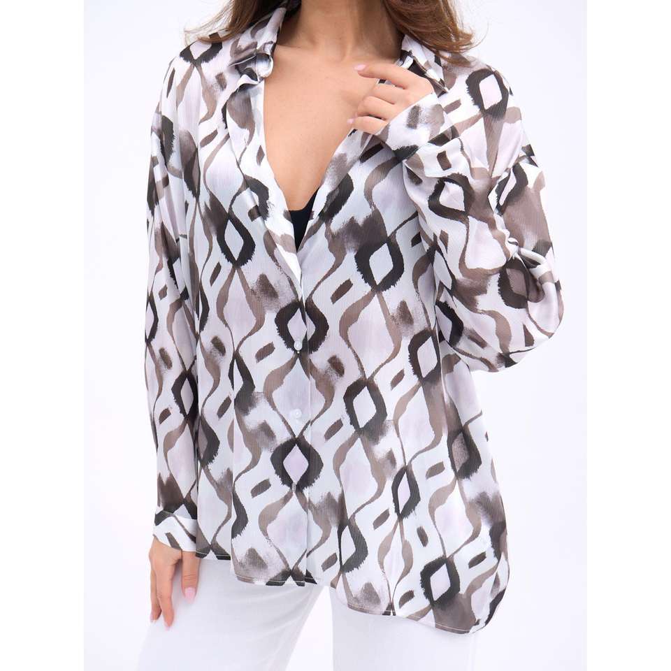 เสื้อเชิ้ตผ้าชีฟองพิมพ์ลายผู้หญิงมิวนิก กระดุมหน้า สวมใส่สบายทุกวัน สีขาว ดำ น้ำตาล ลายพิมพ์ แขนยาว