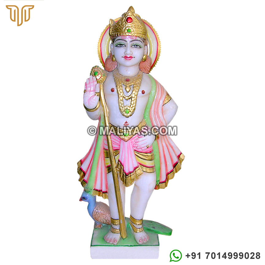 รูปปั้นหินอ่อนมูรูกัน สวามี | รูปปั้นพระมูรุกันแกะสลักด้วยมือจากหินอ่อนสีขาว พร้อมเวลและนกยูง – มาลียาส