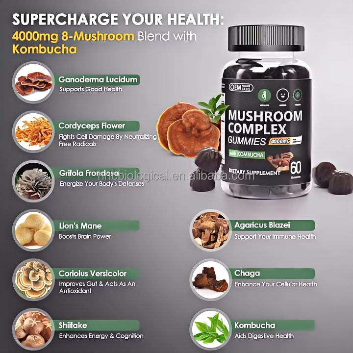 กัมมี่4000มก. เห็ด8-ผสมกับ Kombucha สนับสนุนสมองและภูมิคุ้มกันสุขภาพสำหรับผู้ใหญ่-เกรดอาหารเพื่อสุขภาพ