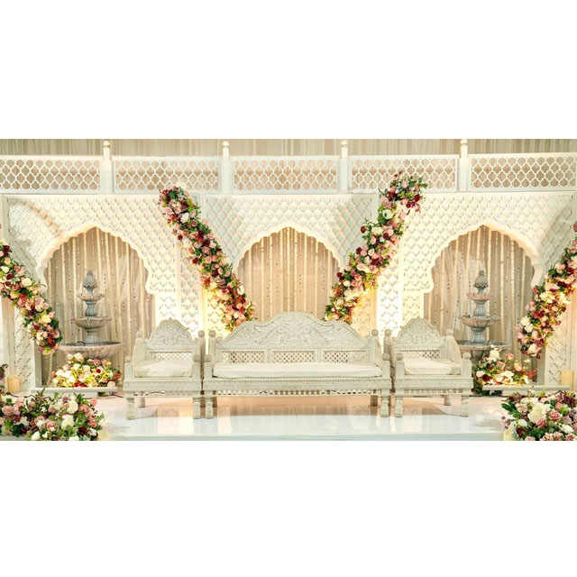 ชุดเฟอร์นิเจอร์เวทีงานแต่งงานมุสลิมแบบวอลิมา ผลิตในสหราชอาณาจักร ปรับแต่งได้ ทำจากไฟเบอร์กลาส น้ำหนักเบา รุ่นใหม่ล่าสุด ฉากหลังสำหรับงานแต่งงานแบบปากีสถาน