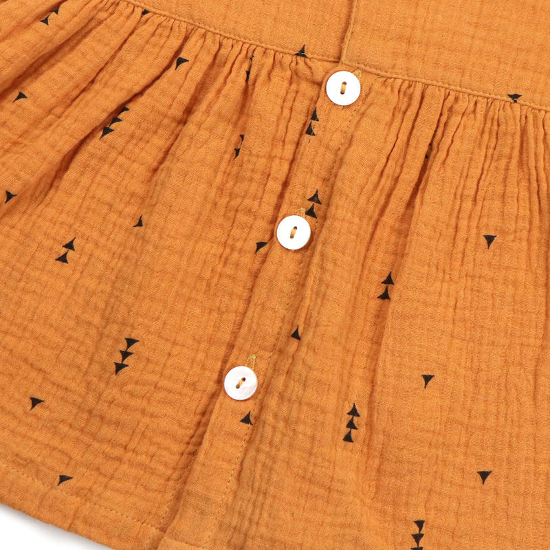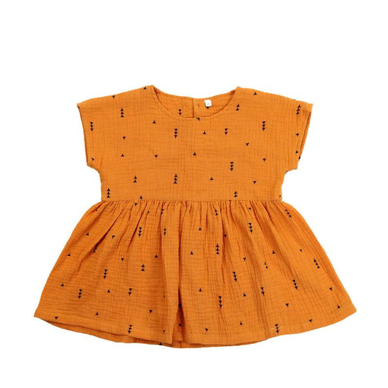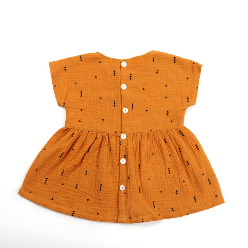 ชุดเดรสผ้ามัสลินผ้ากอซแขนสั้นสำหรับเด็กทารกชุดเดรสผ้าฝ้ายทรงเรขาคณิตมีกระดุมเต็มรูปแบบดีไซน์ปิดด้านหลัง