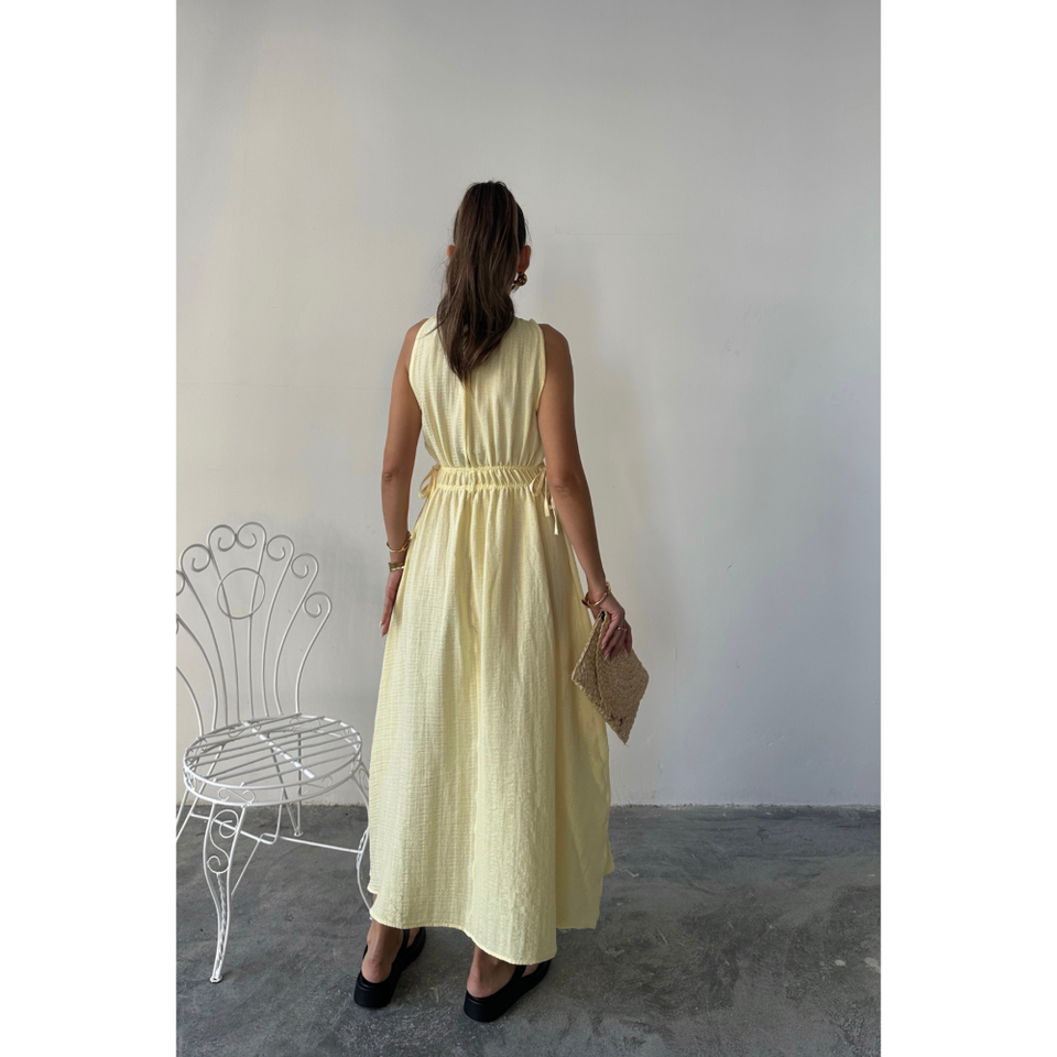 เดรสยาวมัสลินแขนกุดสีเหลืองเอวยางยืดลำลองเดรสยาวผู้หญิงสไตล์ฤดูร้อน