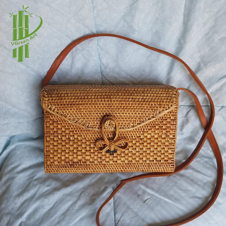 กระเป๋าหวายคาดลำตัวแบบถักด้วยมือ,ทรงซองจดหมายสีน้ำตาลอ่อน