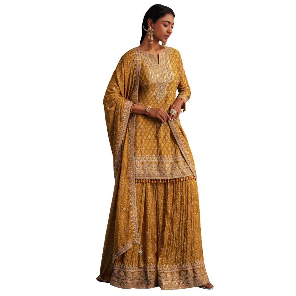 ชุดพาลาซโซ่ผ้าชินออนสีเหลืองมัสตาร์ดสำหรับผู้หญิงเครื่องแต่งกายแนวพื้นเมือง