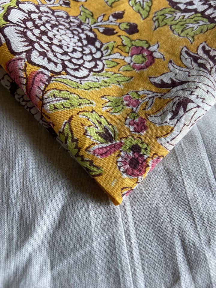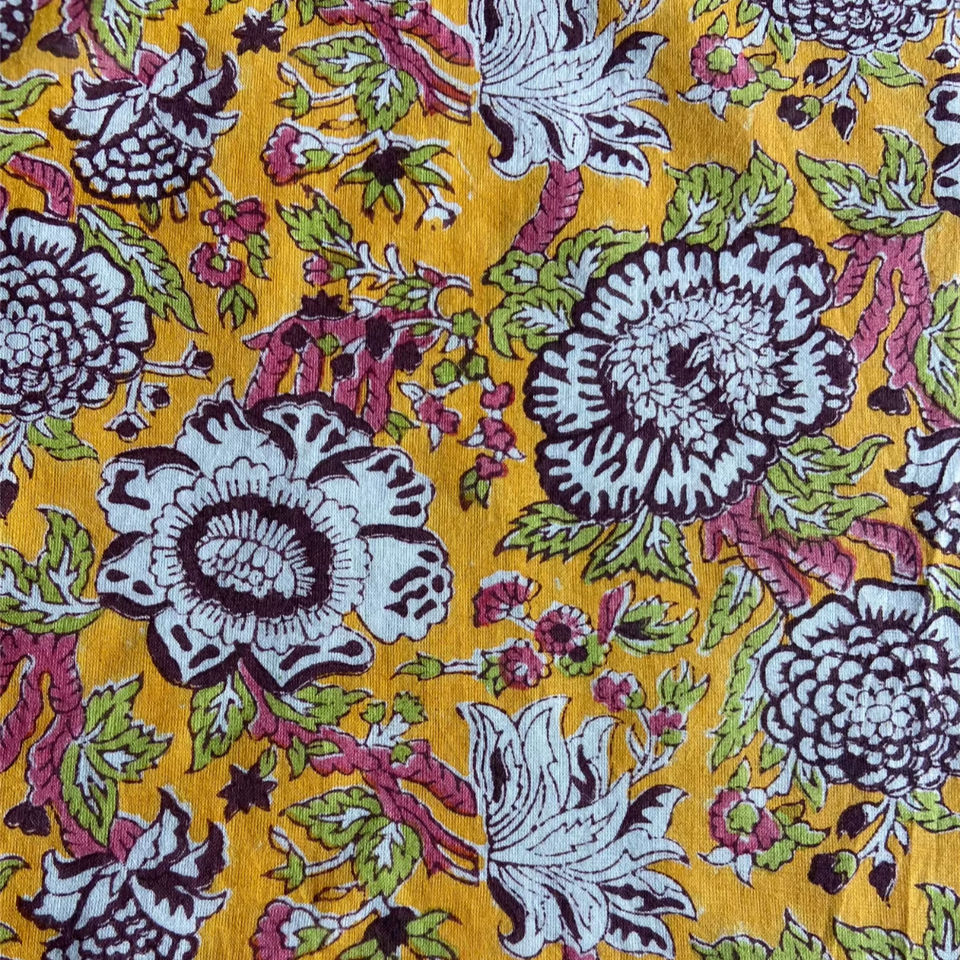ผ้าฝ้ายพิมพ์ลายดอกไม้สีเหลืองมัสตาร์ด ลายพืชพรรณยุโรปแบบวินเทจ