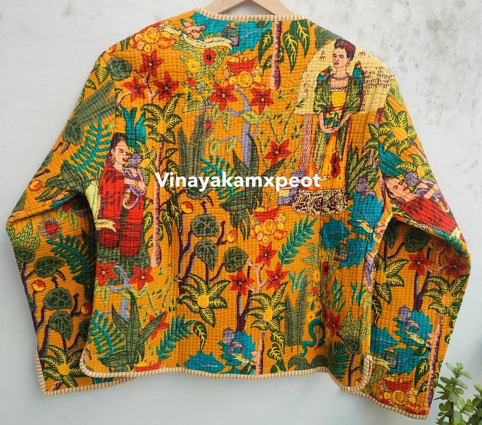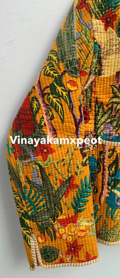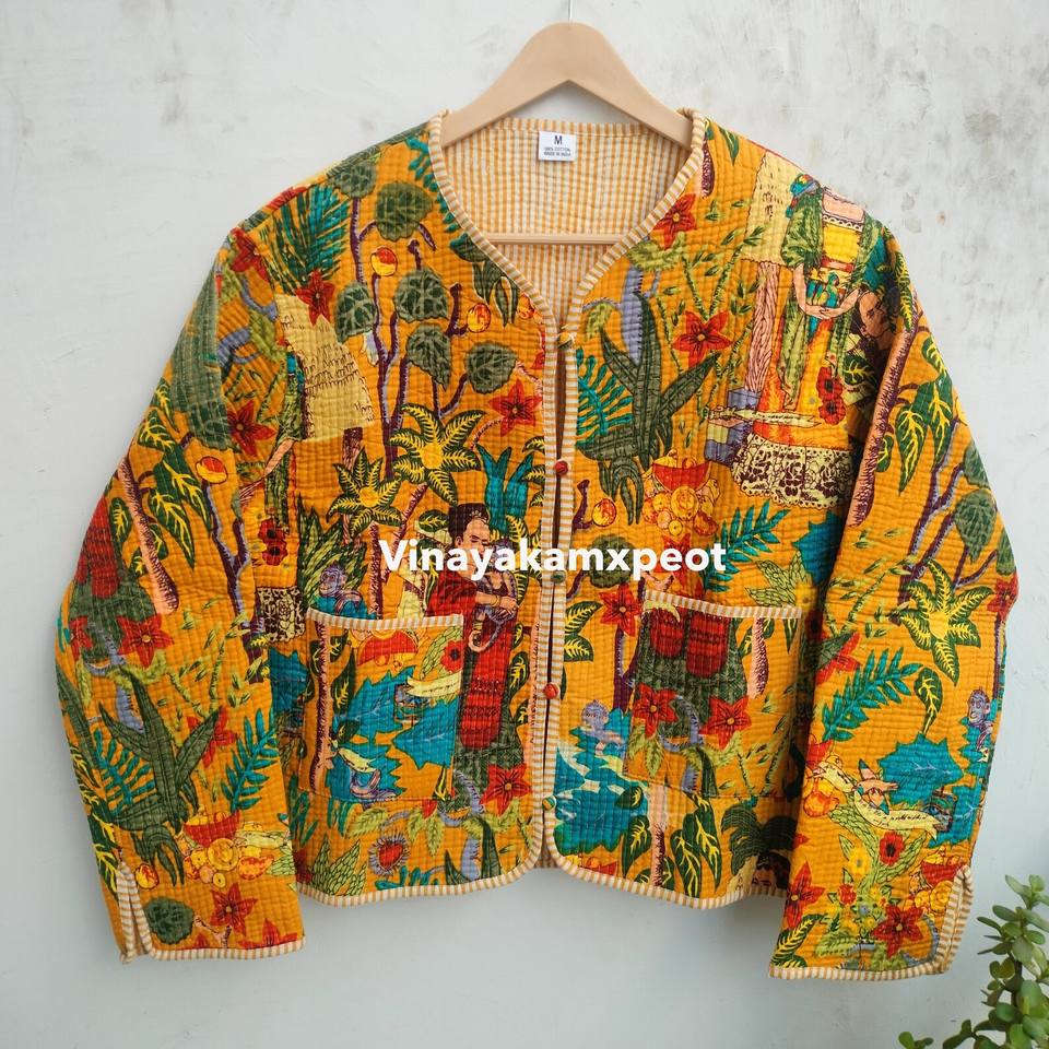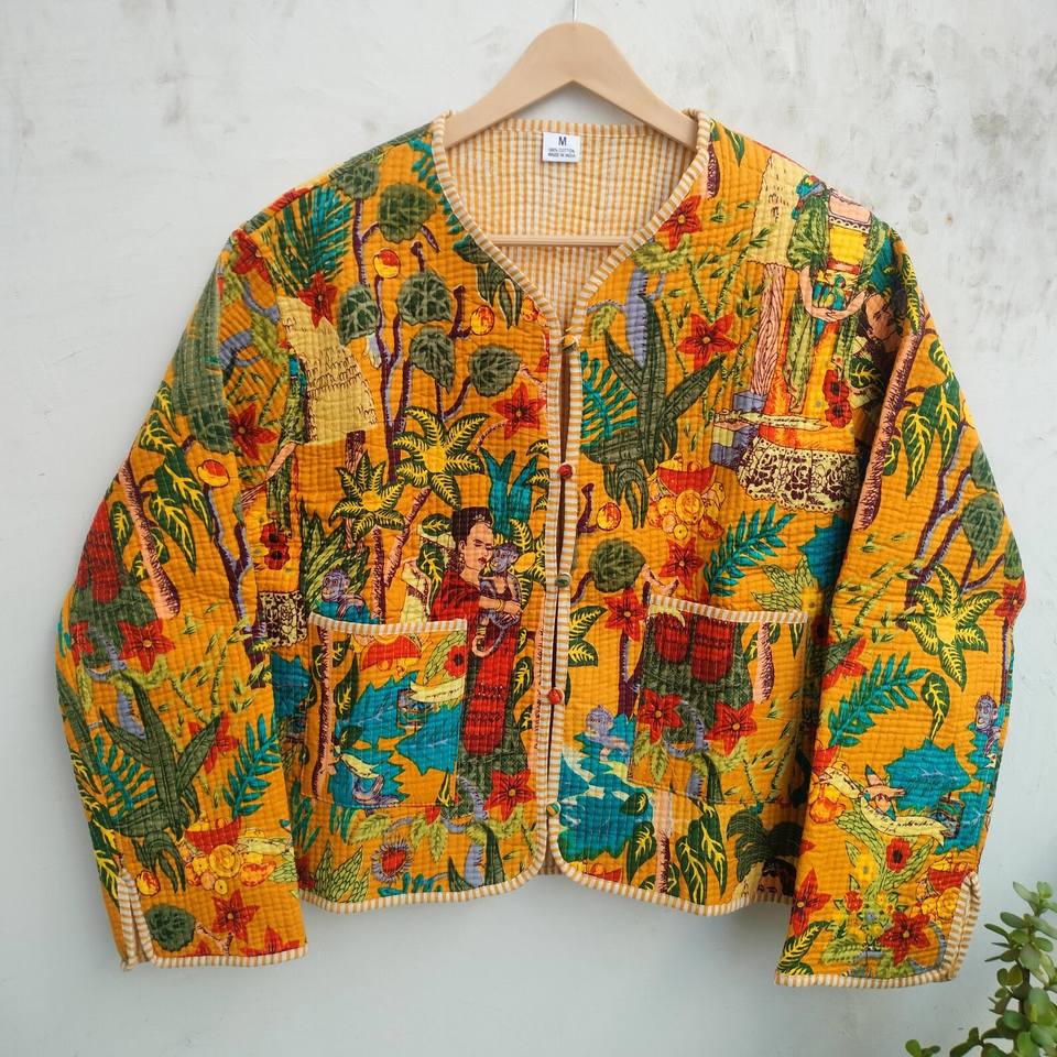 เสื้อแจ็คเก็ตผู้หญิงแขนยาวลายดอกไม้สีเหลืองมัสตาร์ดสไตล์วินเทจ ทำมือจากผ้าฝ้ายควิลท์แบบคันธา เป็นมิตรต่อสิ่งแวดล้อม เหมาะสำหรับฤดูหนาว