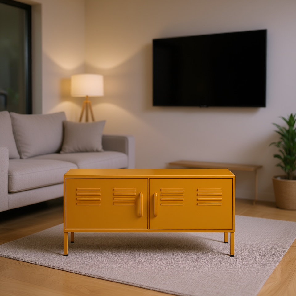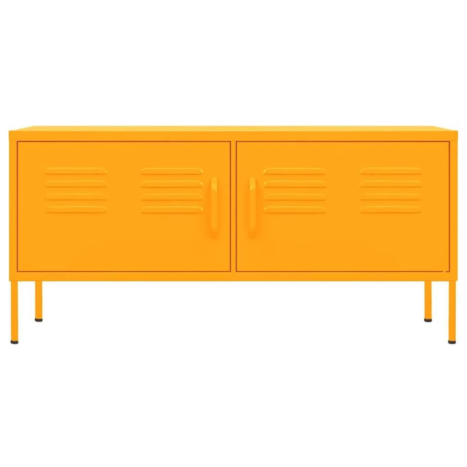 ชั้นวางทีวีสีเหลืองมัสตาร์ด 41.3 X 13.8 X 19.7 นิ้ว ดีไซน์อุตสาหกรรมเหล็ก สำหรับจัดเก็บของในห้องนั่งเล่น