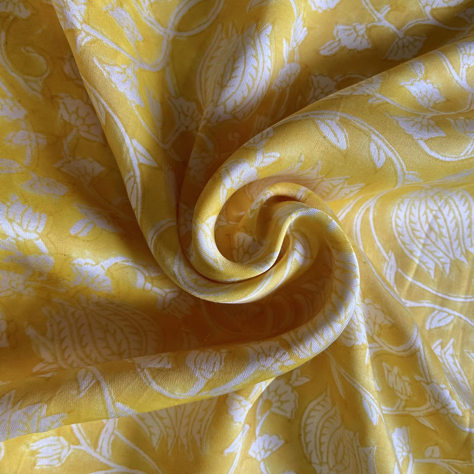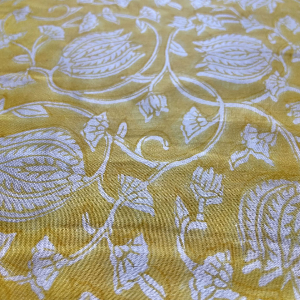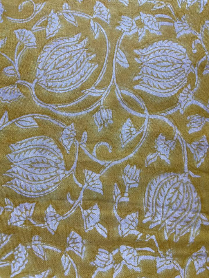 ผ้าฝ้ายพิมพ์ลายดอกไม้สีเหลืองมัสตาร์ดและสีขาว ลายเถาวัลย์ พิมพ์ด้วยมือ งานฝีมือดั้งเดิม