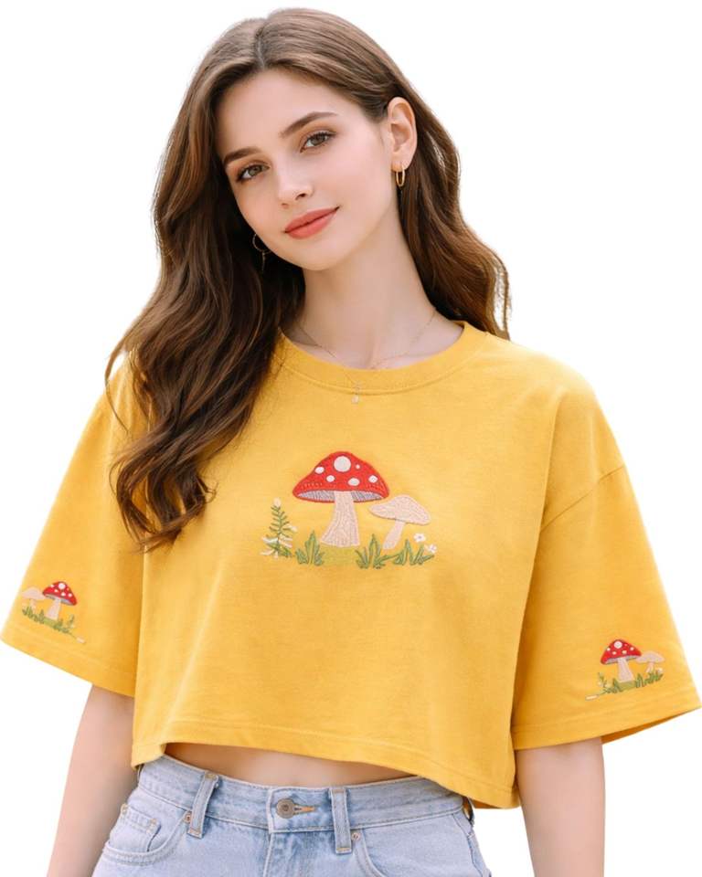 เสื้อยืดครอปสีเหลืองมัสตาร์ดสำหรับผู้หญิง ปักลายเห็ด แขนสั้น สไตล์ลำลอง แฟชั่น ผ้าคอตตอนผสม เนื้อนุ่ม เสื้อผู้หญิงสำหรับฤดูร้อน ขายส่ง