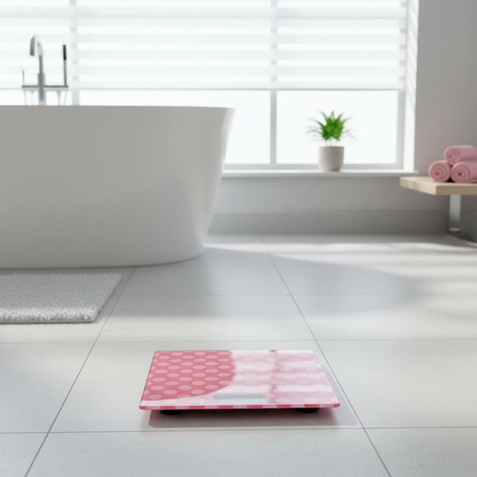 เครื่องชั่งน้ำหนักดิจิตอลแบบกระจกนิรภัยทรงสี่เหลี่ยมผืนผ้า แสดงผลแบบดิจิตอล ใช้พลังงานจากแบตเตอรี่