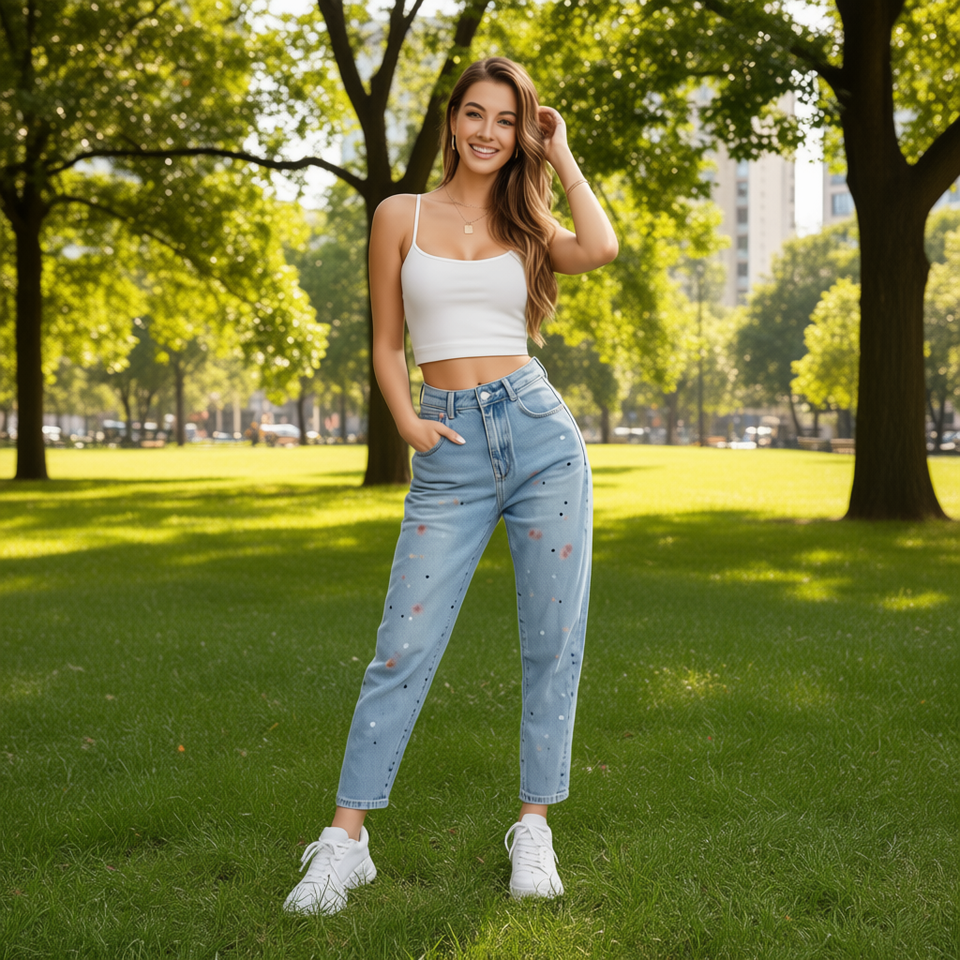 กางเกงยีนส์ทรงตรงเอวสูงสำหรับผู้หญิง ความยาวข้อเท้า ทรงหลวม ผ้าเดนิมสโตนวอช ลายจุด ผ้าฝ้าย สไตล์ลำลองสำหรับฤดูร้อน