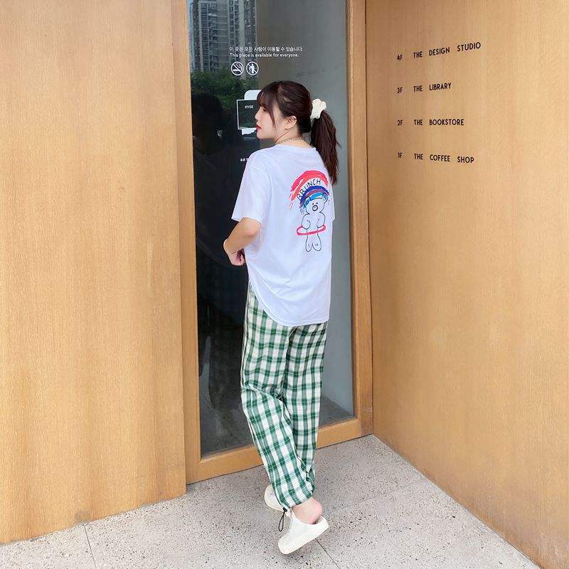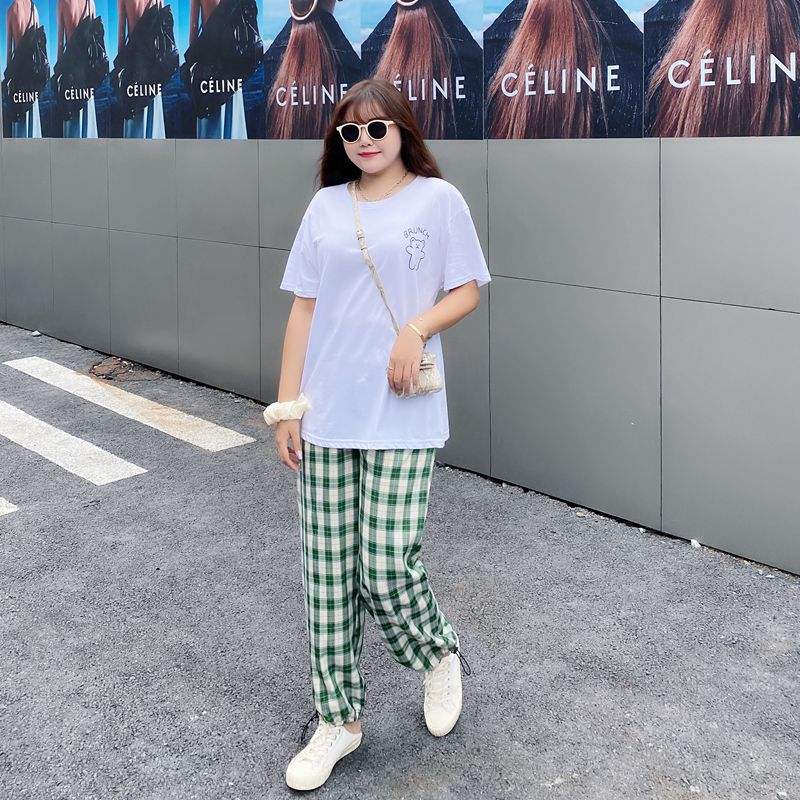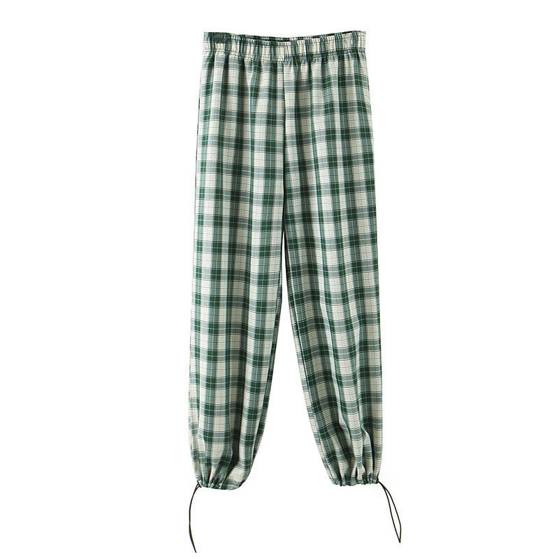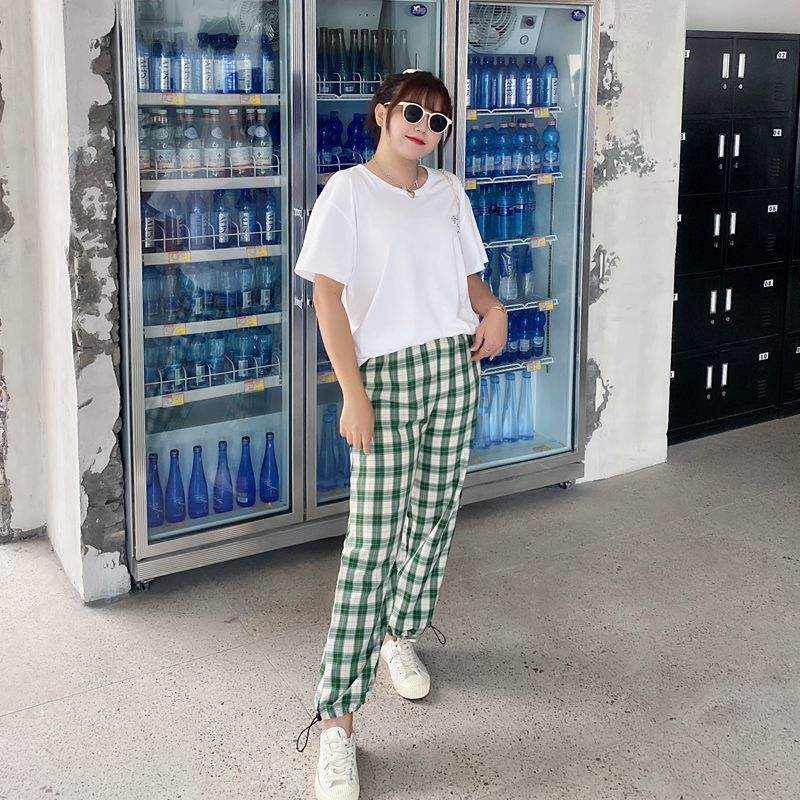 กางเกงขายาวทรงกระบอกเอวสูงผ้าฝ้ายใยไผ่ระบายอากาศได้ดีสีเขียวลายตารางสำหรับผู้หญิงไซส์ใหญ่ รุ่น N7626