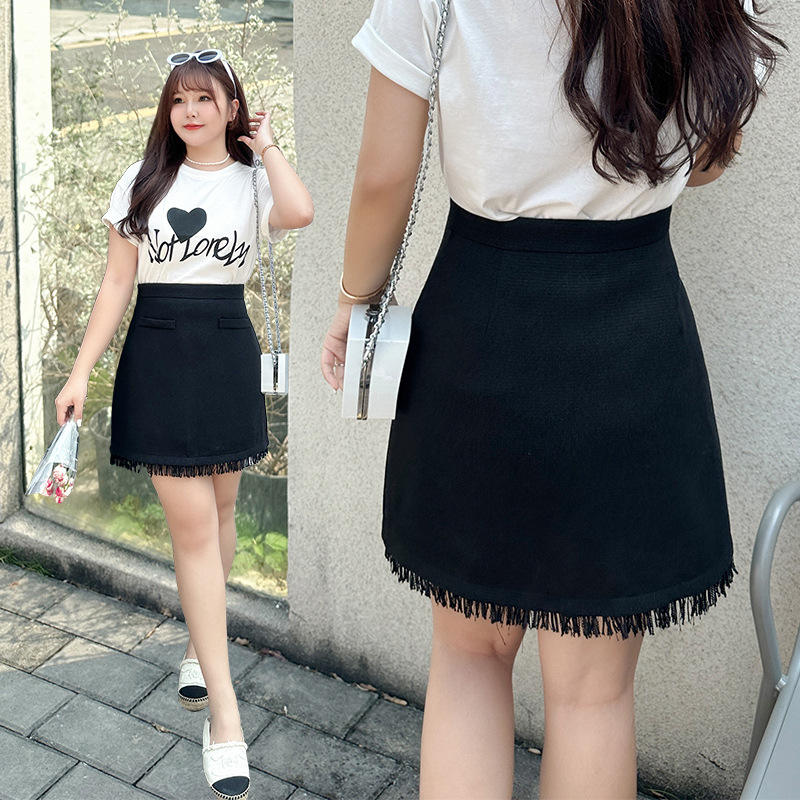 กระโปรงมินิทรงเอไลน์สีดำประดับพู่สำหรับผู้หญิงไซส์ใหญ่ รุ่น N8680 ผ้าโพลีเอสเตอร์สีพื้น เอวยางยืด