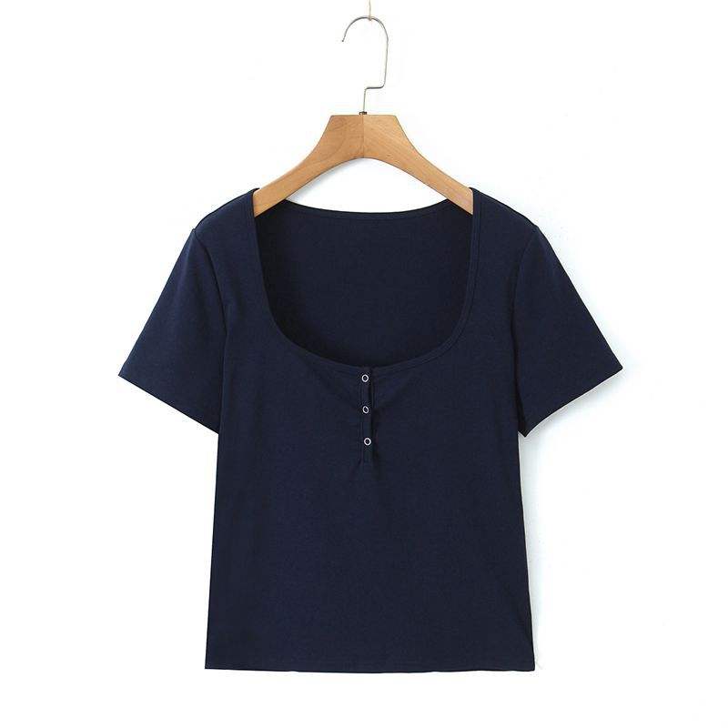 เสื้อยืดแขนสั้นผู้หญิงไซส์ใหญ่ N8845 สีกรมท่า ผ้าฝ้ายถักติดกระดุม สไตล์ BM