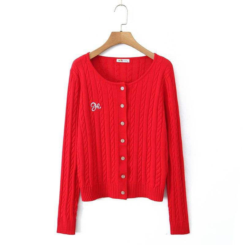 เสื้อคาร์ดิแกนไหมพรมถักลายสีแดงสำหรับผู้หญิง รุ่น N9162 ปักลายสไตล์วินเทจ แขนยาว ความหนาปานกลาง สีพื้น