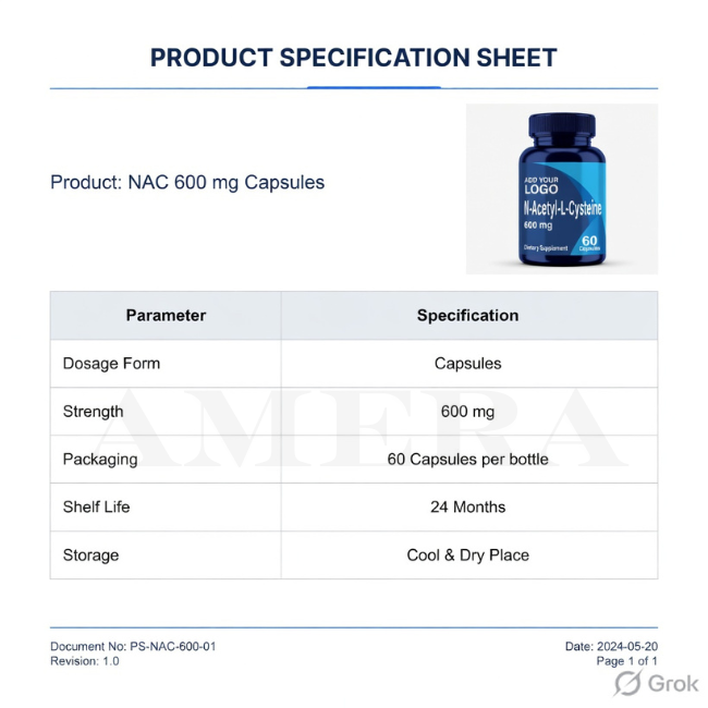 แคปซูล NAC 600 มก. เกรดอาหาร สำหรับเสริมอาหาร จำหน่ายแบบปริมาณมาก ได้รับการรับรองมาตรฐาน GMP
