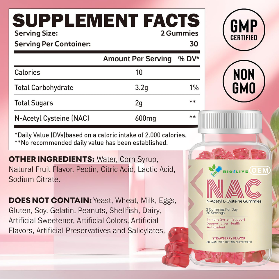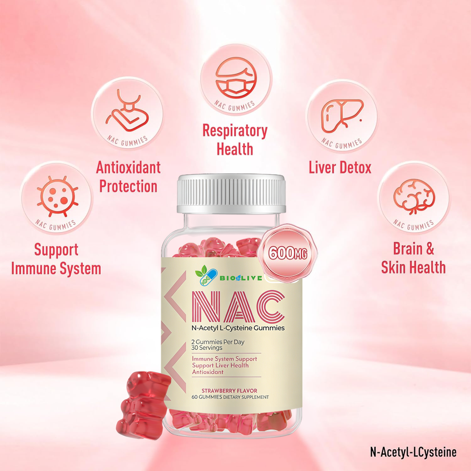 เอ็นเอซี เอ็น-อะซีทิล แอล-ซิสเทอีน กัมมี่ รสสตรอว์เบอร์รี อาหารเสริมแบบเคี้ยวได้ อาหารเสริมกัมมี่สำหรับผู้ใหญ่ วัตถุดิบจากธรรมชาติ