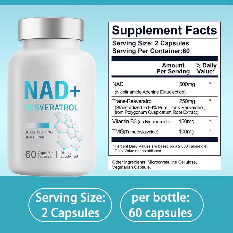 ผลิตภัณฑ์เสริมอาหารแคปซูล NAD Plus Resveratrol บำรุงความงาม 60 แคปซูล รับผลิตแบบ OEM ODM ได้รับการรับรองมาตรฐาน GMP เกรดอาหาร สำหรับต่อต้านริ้วรอยและสารต้านอนุมูลอิสระ
