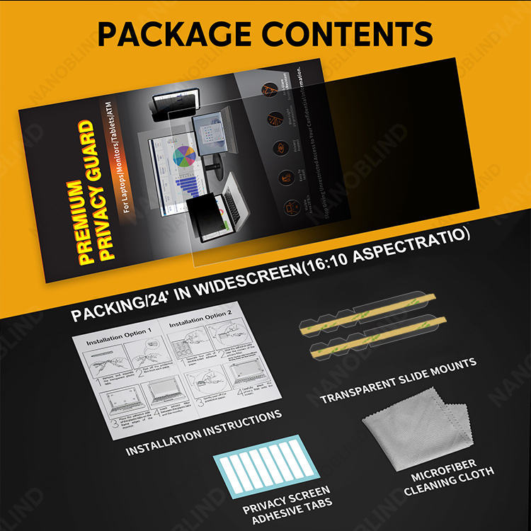 ตัวกรองความเป็นส่วนตัว1ชิ้น + ถุง OPP + ผ้าสะอาด12*18ซม. + แถบพลาสติก + สติกเกอร์กาวสองชั้น9ชิ้น + คำแนะนำ + บรรจุภัณฑ์ขายปลีกส่วนบุคคล