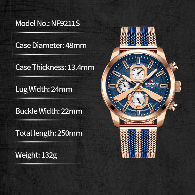 นาฬิกาควอตซ์ NAVIFORCE รุ่น NF9211 สำหรับผู้ชาย แสดงวันและวันที่ สายตาข่ายเหล็ก ดีไซน์ทันสมัย พร้อมปฏิทิน