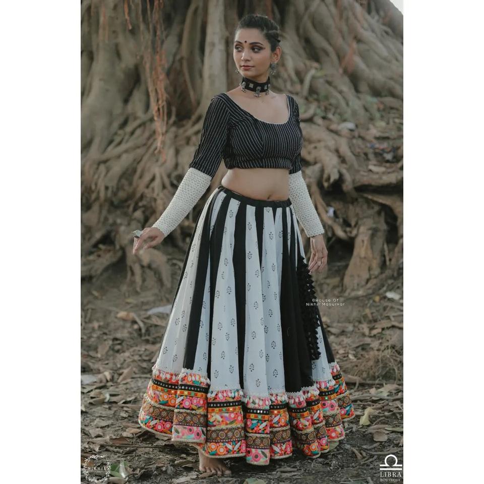 Lehengas choli ชุดเดรสพื้นเมืองสีดำขาวดำทำจากผ้าไหมแฟนซี