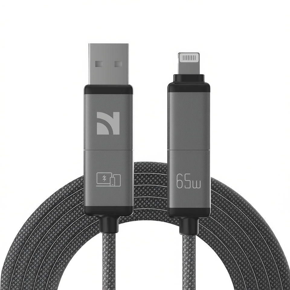 สายเคเบิลอะลูมิเนียมถัก NCC 4-in-1 65W 1.2M XC-0303 USB A + USB-C + สำหรับ Light-NING ชาร์จเร็วสีดำ"