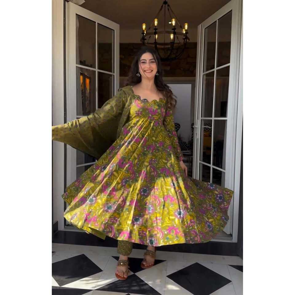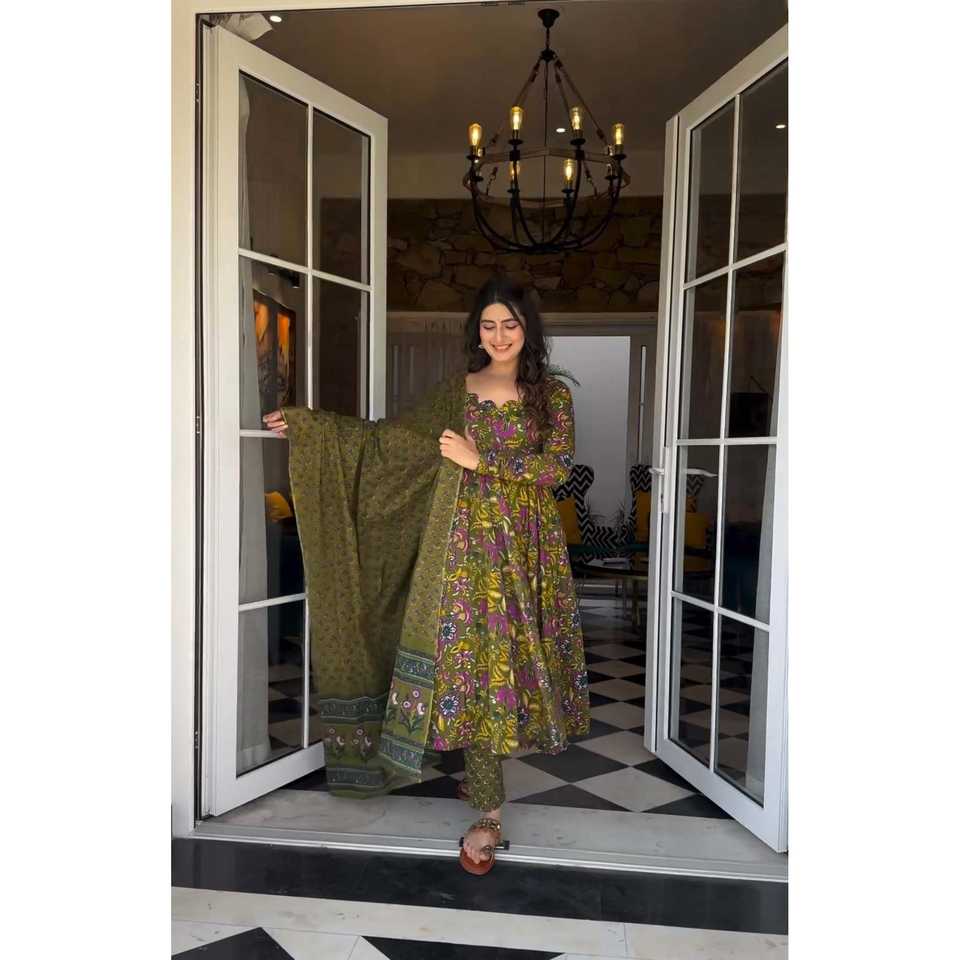 ชุดสูทสีเขียวสวยงามสำหรับผู้หญิง ND พร้อมเสื้อ กางเกง และผ้าคลุมไหล่ พิมพ์ลายดิจิทัล สำหรับงานปาร์ตี้ ไซส์ L