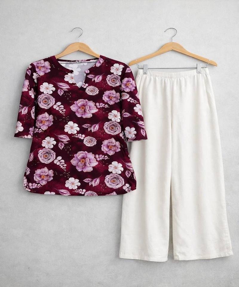สินค้ามาใหม่ ชุดเสื้อท็อปและกางเกงขายาวพิมพ์ลายดิจิทัล ผ้าเรยอนคอตตอน สำหรับใส่ทุกวัน ราคาขายส่ง เสื้อผ้าชาติพันธุ์ หลายสี