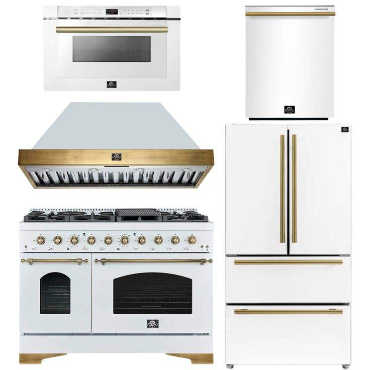 ชุดเครื่องทำกาแฟเอสเพรสโซ่ใหม่ - เตาแก๊สขนาด 30 นิ้ว ตู้เย็นขนาด 36 นิ้ว พร้อมเครื่องทำน้ำแข็งและเครื่องล้างจาน สีขาว ตกแต่งด้วยทองเหลืองโบราณ