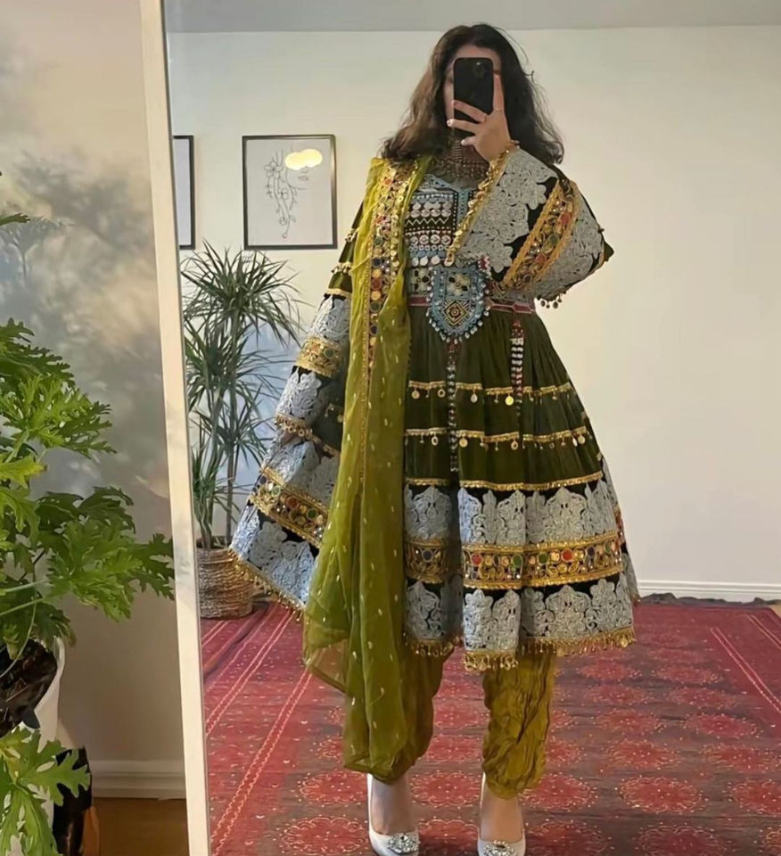 ชุดเดรสสตรีแบบดั้งเดิมสไตล์อัฟกานบาลูชิ งานปักมือสุดหรูหรา ประดับกระจกและด้ายปักอย่างประณีต