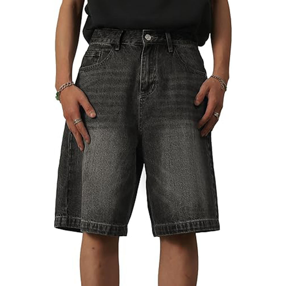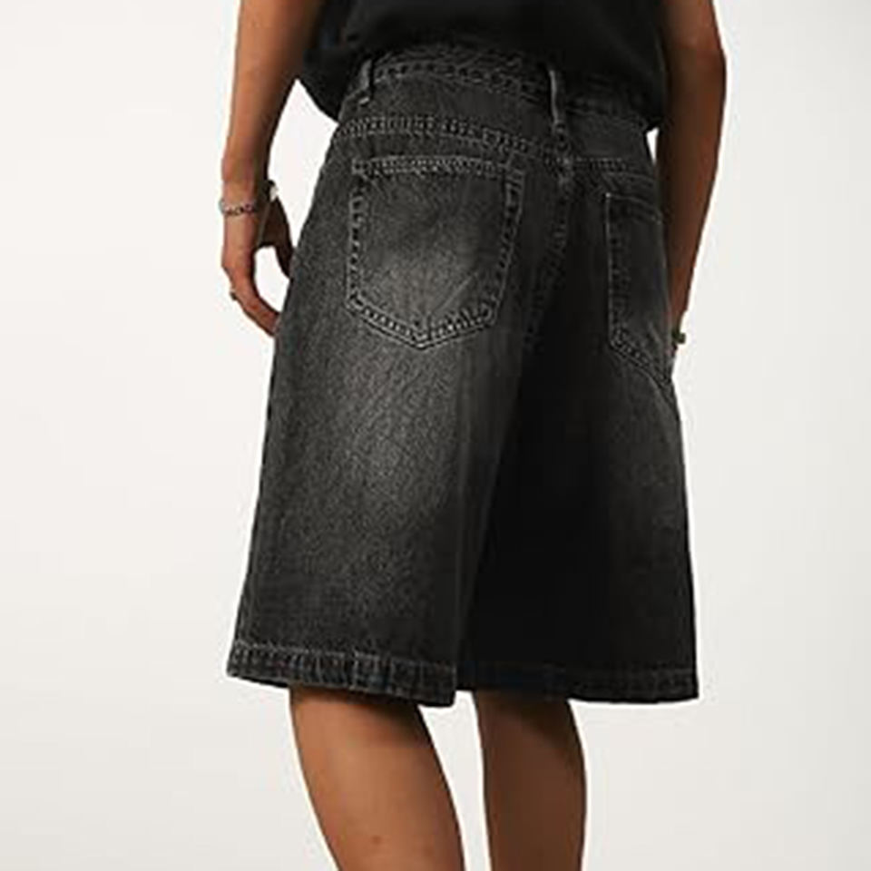 กางเกงยีนส์ขาสั้นผู้ชายแฟชั่นใหม่ สไตล์วินเทจ สีดำฟอก ทรงหลวม เอวต่ำ ขอบดิบ ขาดๆ แบบแบ็กกี้