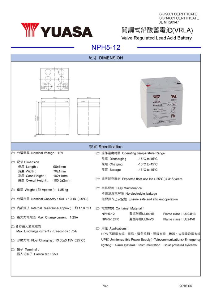 แบตเตอรี่อุตสาหกรรม NEW NPH5-12 6V 5AH สำหรับ YUASA ได้รับการรับรอง MSDS รับประกัน 18 เดือน สำหรับเครื่องมือไฟฟ้า ระบบเตือนภัย และ UPS