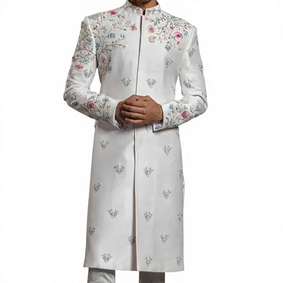 ชุดเชอร์วานีสีขาวสำหรับงานแต่งงาน ชุดสูทผู้ชายปักลายดิ้นทองอย่างดี ระบายอากาศได้ดี กระดุมแถวเดียว ผ้าไหมดิบ พร้อมกางเกง